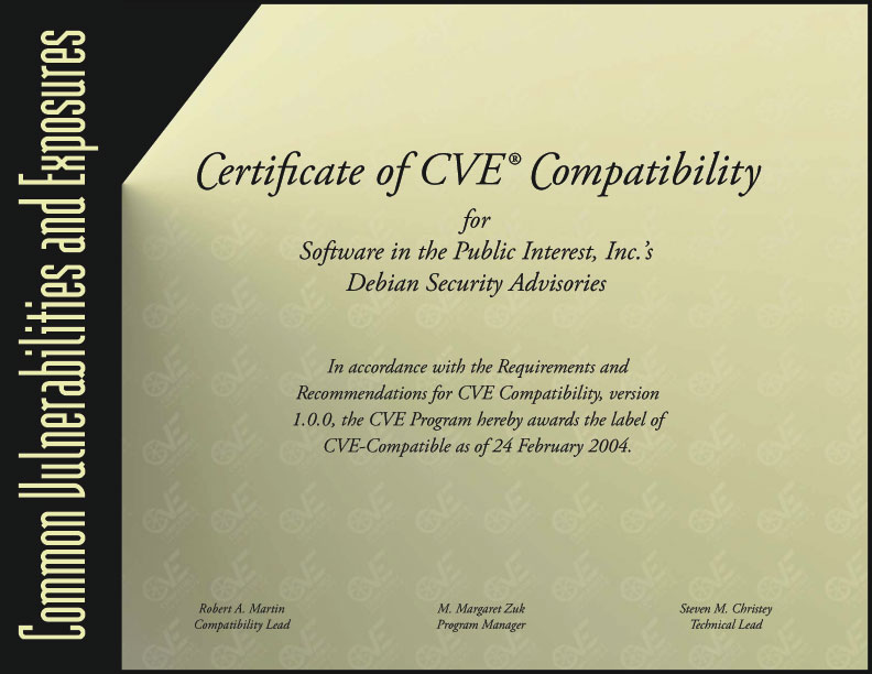 Debian crede che fornire agli utenti informazioni aggiuntive relative alle questioni di sicurezza della distribuzione Debian sia estremamente importante. L'inclusione dei nomi CVE negli avvisi aiuta gli utenti ad associare delle generiche vulnerabilità con gli aggiornamenti Debian, il che riduce il tempo necessario per gestire le vulnerabilità che affliggono i nostri utenti. Inoltre, facilita la gestione della sicurezza in un ambiente dove strumenti di sicurezza con CVE abilitato - come sistemi di rilevamento d'intrusione su rete o su di un host, o strumenti per la valutazione di vulnerabilità - sono già in uso indipendentemente dal fatto che siano basati sulla distribuzione Debian.
